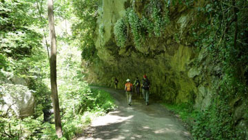 Caminamos bajo una pared rocosa, arqueada como si quisiera cubrirnos con su cresta saliente, de la que van cayendo sobre el camino largas enredaderas con bonitas flores.
