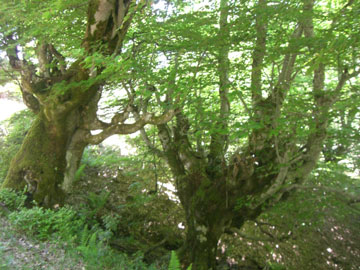 El bosque de Peloño cuenta con 200.000 hayas. Ahora se encuentran vestidas de verde intenso para pasar al sobrio color pardo en otoño-invierno. El interior de este inmenso hayedo alberga una vegetación propia, la que permite la poca luz que dejan pasar los árboles, los musgos y los líquenes proliferan. Aunque lógicamente sombrío nos transmite un gran placer, límpido y luminoso. En este hayedo conviven ejemplares de todas las edades, los brotes nuevos de haya, los hay por muchos sitios, hay troncos fósiles tumbados y cubiertos de musgo, bellos y altos ejemplares en toda su plenitud y ejemplares abuelos que artos ya de crecer se dedican a enroscarse en sí mismos, engordan y se cargan de nudos llegando a tener formas siniestras. Parece como si a Peloño le gustaran las hayas, han colonizado el monte que le da nombre impidiendo que otros árboles se desarrollen, sólo los robledales resisten en los límites del bosque.