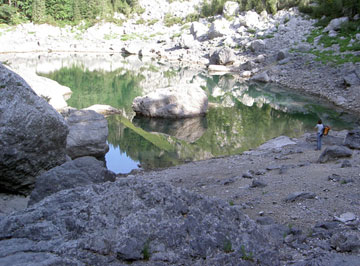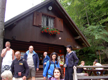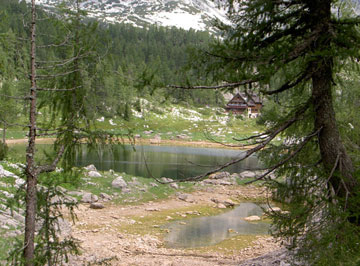 Después de unas cuatro horas, llegamos a Dvojno jezero, parece ya que la vegetación va perdiendo fuste, aún estamos rodeados de bosque, pero a partir de aquí el paisaje empieza a cambiar, la naturaleza mineral empezará a predominar sobre la vegetal. A unos 500 mts. escasos tenemos un refugio el Koca, en el que pararemos largo rato y aprovecharemos para tomar algún refrigerio, y alguna que otra pivo (cerveza en esloveno).