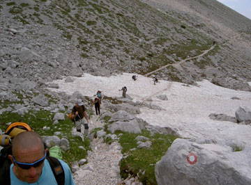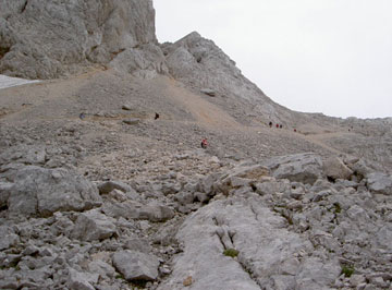 Sin llegar a la masificación, el conjunto de expediciones que van y vienen del refugio es abundante. A lo largo del filiforme sendero podemos contemplar grupos diseminados aquí y allá. El piso se conforma de caquiritas resbaladizas que ponen en peligro nuestro equilibrio. Urban nos hace una exhibición de destreza senderil lanzándose a tumba abierta por aquel terreno tan dificultoso. Los demás apretamos los machos y bajamos como podemos. Hay que ir dosificando las fuerzas, a partir de este punto nuestro grupo se irá estirando. Elena H., Lydia, Migue y el que suscribe decidimos imponer un ritmo más vivaz, Juan Antonio y Luis que van sobraos se van entreteniendo que si una foto aquí, otra allá Elena S., Raquel, Paco y Gonzalo se retrasan algo más y Urban los acompaña. El sendero está muy bien marcado y no ofrece pérdida.