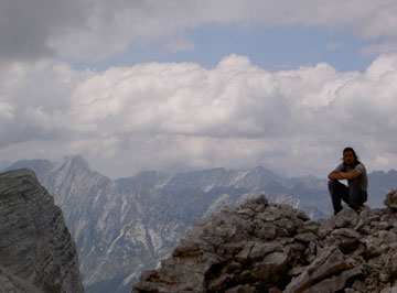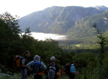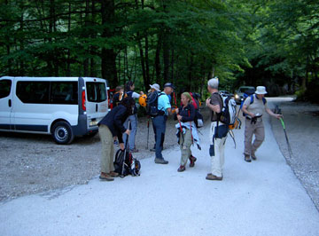 Ya en Bohinjsko Jezero (el lago Bohinj. Para que os vayáis haciendo con el idioma, parece ser que funciona con distintas declinaciones, como el latín, y es de raíz eslava, es decir, ni papa), Elena y un servidor nos paseamos por los alrededores contemplando una magnífica puesta de sol. Nos preparamos para la cena, que tenemos contratada con la estancia, y ya todos reunidos cenamos en alegre tertulia. El día ha sido muy completo, no hemos llegado aún a los niveles de organización que se alcanzarán más adelante, cuando Juan Antonio consiga que todos los walkies funcionen a la perfección, JL haya descifrado el manejo del navegador, los chóferes nos hayamos acoplado con nuestros vehículos pero no ha habido ningún contratiempo digno de mención. Cansados y contentos damos una vuelta por los alrededores, y a la piltra. Al día siguiente algunos tenemos que levantarnos antes de las 6:00 hs. A esa hora nuestro guía nos espera para conducirnos al Triglav. Además esa será la tónica tempranera impuesta por nuestra organizadora para todo el viaje. A pesar de nuestros ruegos y protestas, siempre se mantuvo inflexible y no hubo forma de que transigiera a costa de acortar un poco el programa previsto. Ya te digo, programa, programa, programa, ... La verdad es que al final, todos se lo agradecimos, pues gracias a su intransigencia, nuestra impresión de los lugares visitados fue de lo más completa.