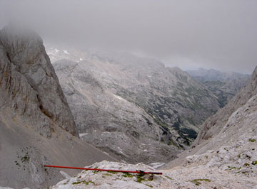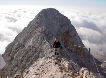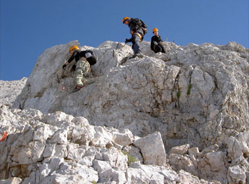 Nos espera la vía ferrata que nos conducirá a la cumbre del Triglav. Tras caminar unos escasos metros, comienzan las primeras trepadas. La señalización es muy buena, y los apoyos están colocados de forma que se trepa con agilidad y sin gran esfuerzo.