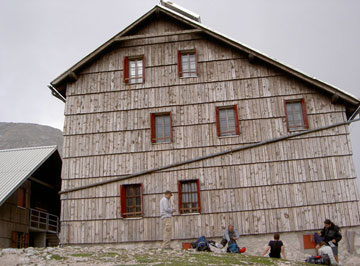 Tomo resuello, echo algunas fotos y espero a los siguientes. El refugio se compone de dos edificios principales, uno donde están la cocina, los comedores y algún dormitorio, y otro sólo de dormitorios, que por lo visto únicamente abren los meses de verano y no sé si alguno más, tiene un inconveniente y es que no hay agua corriente, al menos para uso de los visitantes, aunque están atendidos y limpios. Aparte tenemos un edificio que constituye una especie de vivac que permanece abierto en invierno, desatendido, y las letrinas, de las que emana un olor deleznable.