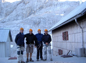 Fotos, sacada de bandera, fotos de grupo y para abajo. Si subimos con el sol a nuestra espalda significa que lo hicimos por el Este, la bajada la haremos por la cara Oeste. También está ferreteada y es algo más complicada que la subida, pero nos vamos defendiendo bastante bien, hasta ahora los arneses van de adorno. Sólo un paso requiere que se utilicen, para sentirte algo más seguro, pero la verdad no es que hagan mucha falta.