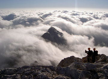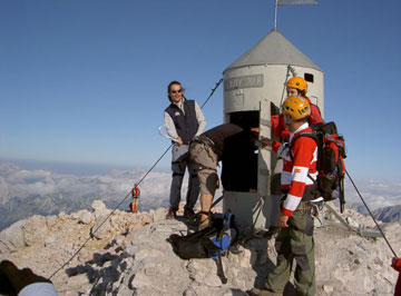 Al llegar a la cumbre hay una especie de bidón grande con cubierta cónica y una puerta, donde la tradición manda que los que suben por primera vez, se coloquen a la entrada dispuestos para ser azotados en el trasero por sus guías. Tres azotes harán que el bautizado de esta manera vuelva otra vez al Triglav. Cumplimos con la tradición y algunos le sacan cierto gustillo a eso de ser azotados, desde luego no me cabe duda de que esto de la montaña tiene cierto componente masoquista.