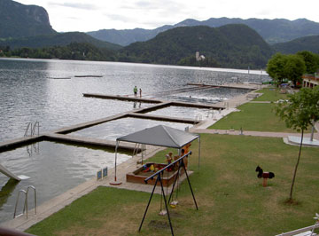 Cuando llegamos a nuestro hotel, y después de dejar las mochilas, Elena y yo cogemos los bañadores y nos vamos al lago con la intención de darnos un chapuzón. Se encuentra bastante concurrido, buscamos un lugar despejado y me doy una zambullida que me deja como nuevo. Una auténtica gozada. Elena, después de pensárselo bastante, no se decide. Cenamos en alegre contertulia, contándonos nuestras andanzas por esos montes eslovenos, preparamos la jornada del día siguiente, y después de tomar un poco el fresco en la terraza del hotel, nos vamos a la cama. Con esto damos por concluido el día y la primera parte de estas crónicas eslovenas.