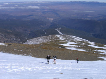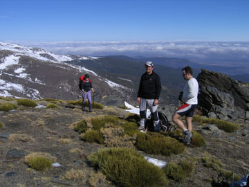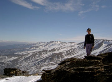es fascinante; se pueden ver las caras este de todos los tres miles de Sierra Nevada hasta el Veleta, primero la Alcazaba, luego el Mulhacén y, al fondo el Veleta. A la derecha, un poco por debajo de nosotros, quedaba el Picón de Jeres y hacia abajo los corredores del río Alhorí .
