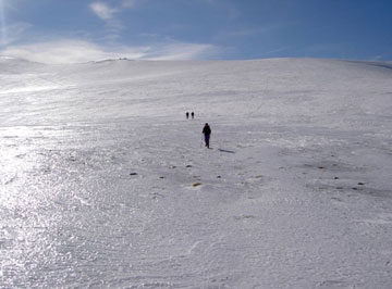 había que bajar, ¡qué remedio!. Así que iniciamos el descenso. Los primeros tramos de la bajada sobre nieve fueron espectaculares: bajar sin esfuerzo por esas enormes laderas de un blanco luminoso y con la seguridad de los crampones es otra experiencia única que os vuelvo a recomendar sin ninguna duda.