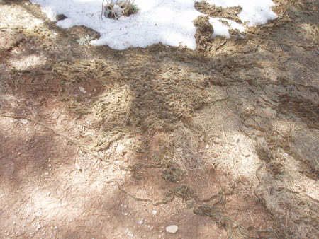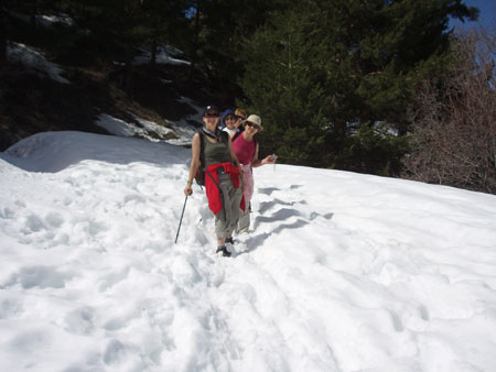 Al cabo de un rato, retomamos la desagradable visión de las apestosas orugas y ¡sorpresa!: nieve en el camino. Nos ponemos muy contentas por pisar un poco de nieve, pero ¿qué? Nieve, más nieve, ¡hartura de nieve! En la Sierra de las Nieves, no quisimos ir al Torrecilla por no pisar nieve y mojarnos (no teníamos botas impermeables), pues ¡ahora nos estamos hartando! ¿Cuándo se acaba? ¡Cuidado! ¡Por aquí se hunde! ¡Aaaaaaaaah!