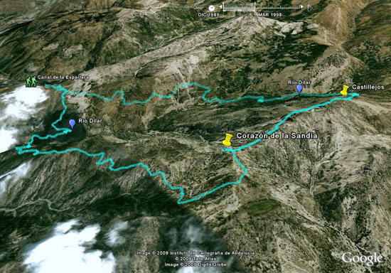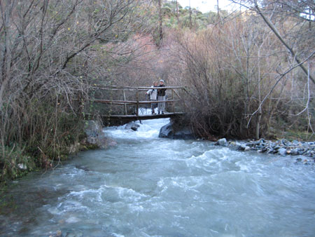 El río Dílar iba con mucho caudal después de las últimas lluvias. Tuvimos que cruzar el río a pelo, el agua nos cubría toda la pierna y nos arrastraba. Con apuros conseguimos cruzarlo.