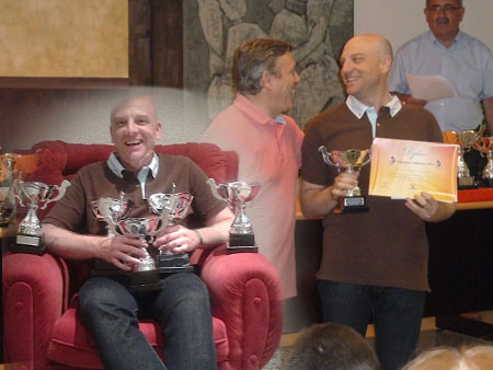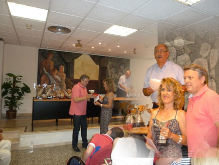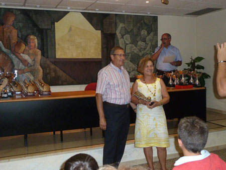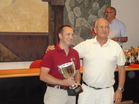 Miguel, recoge el premio de manos de Miguel Angel. Muy acaparador recoge su trofeo y unos cuantos más como indica la foto y su gran sonrisa.