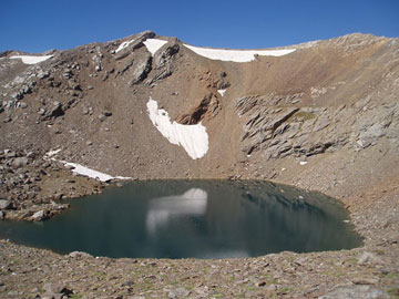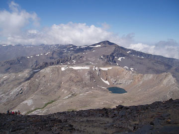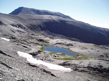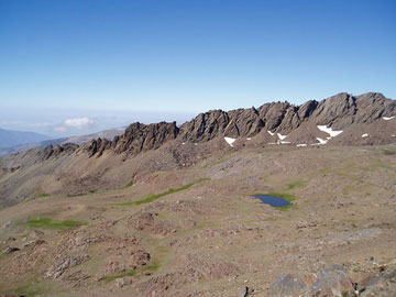 De la Caldera nos dirigimos enseguida al Collado del Ciervo donde realizamos la pequeña parada de rigor para contemplar por el este La Alcazaba y la Laguna de la Mosca al pie del Mulhacen, y por el oeste los Crestones de Río Seco, El Veleta, Los Machos... Espectáculos únicos que, por muchas veces que vengas, nunca te cansas de admirar.