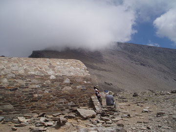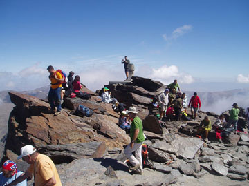 Y ya sólo nos queda acometer la dura subida hasta la cumbre. Tardamos aproximadamente una hora en subir, a buen ritmo pero sin prisas, y a las 13:00h. estamos todos encaramados en el pico mas alto de la península ibérica, nuestro querido Mulhacen. Allí disfrutamos del ambiente de siempre: montañeros de todos los rincones de España y parte del extranjero y hasta un ciclista que ha tenido el valor y la fuerza de montarse con su bici en lo alto de la cumbre.