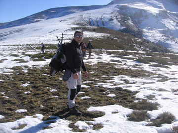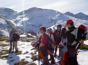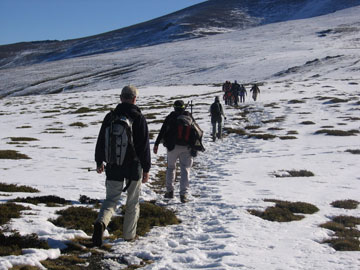 Seguimos nuestra subida suave pero continúa hasta el refugio de Peña Partida, ya a 2.500 mts. Momento en que aprovechamos para reponer fuerzas y algunos decidimos estrenar nuestras polainas (dime como se ponen, unos se las compraron el día anterior, otros se las compraron en verano