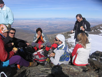 Ya en la cumbre, las fotos de rigor, la admiración de nuestras montañas (Veleta, Alcazaba, Mulhacen, Vacares,..), saborear las viandas así como el vinillo que también le sentó a mas de uno.