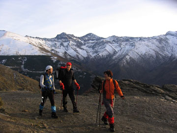 Iniciamos el descenso con precaución buscando los pasos más difíciles para darle a la cosa un poco de aliciente y no terminar de dormirnos, mientras vamos preparando el terreno para futuras ascensiones de mayor calado. Dirijo mi mirada a la izquierda hacia el Veleta y pienso en las pobres criaturas que a esa misma hora se deslizarán con sus tablas hacinadamente por las escasas laderas esquiables las pocas que hayan innivado artificialmente, porque de nieve verdaderamente caída, poca, muy poca-. Esta año apunta a escaso en precipitaciones, cosa a la que cada vez estamos más acostumbrados, a diferencia del pasado, generoso como pocos. Por ahí parece que van a ir los tiros, si no a peor, en el futuro: un año bueno y dos malos, más o menos. No por ser esto una auténtica pena y muy perjudicial para casi todo, deja de tener su lado positivo - por buscarle alguno- en el sentido de que calla aquellas voces que no hace mucho clamaban pidiendo ampliaciones y más pistas a diestro y siniestro, reivindicaciones vertidas a mi entender desde la ignorancia y el más absoluto desconocimiento de la realidad de Sierra Nevada. Ojalá permanezcan mucho tiempo callados.