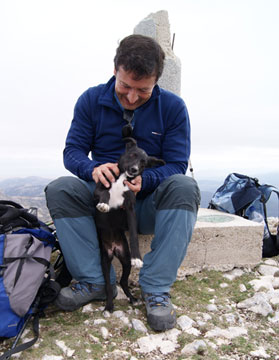 Reanudamos la marcha y enfilamos nuestra vista hacia el Peñón de La Cruz. Con paso tranquilo, pero firme, y siempre precedidos por nuestro perrunos amigos nos fuimos acercando a nuestra meta. Un pequeño esfuerzo más y llegamos a la cumbre. Y con nuestra llegada a la cumbre llegó también el momento de la despedida. Despedida que me resultó especialmente triste cuando tuve que decir adiós a mi amiguito del corbatín blanco(ese perrillo era una copia exacta de otro que tuve yo hace algún tiempo y que, desgraciadamente, perdí). Nuestros nuevos camaradas volvieron sobre sus pasos hacia Prado Negro dispuestos a esperar a una nueva partida de aventureros andarines a los que acompañar por las agrestes tierras de Sierra Arana.