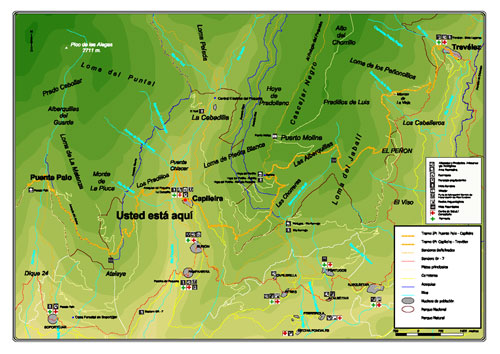 Salimos de Capileira ascendiendo por la Carretera de la Sierra, dejando a la derecha el camping. Cuando llevamos 800 m. por el asfalto, tomamos a la izquierda un sendero que sube una fuerte rampa, y se bifurca. Seguimos a la derecha hasta alcanzar por el chaparral de nuevo la carretera. La cruzamos para continuar remontando por la vereda para salir de nuevo al asfalto. Seguimos por la calzada hasta abandonarla definitivamente después de dejar a la derecha una amplia pista de tierra que conduce al Área Recreativa del Río Bermejo y al pueblo de Trevélez.