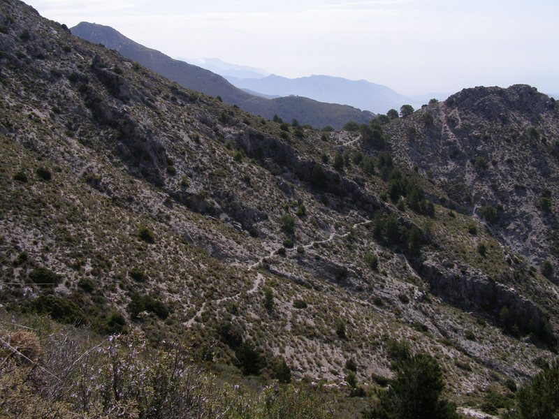 Cubierta esta etapa hay que seguir en dirección Este hasta encontrar un cruce que nos introduce en otro sendero que tiene como destino el "Cañón del río Almanchares" y el "Collado de la Monticara". Desde allí sale un camino que nos conduce a la "Fuente de la Pisiaca del Niño Dios" y al municipio de Sedella; pero no es este el camino que hay que tomar; en su lugar, tomaremos el camino que va en dirección Oeste. Durante el trayecto nos encontramos con dos arroyos hasta alcanzar la zona conocida como "Collado de la Gitana" a 1.416 m. Llegando a este punto y tras haber caminado alrededor de 2:30 h., podemos decir que hemos cubierto la mitad del trayecto de la ascensión.