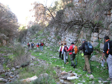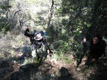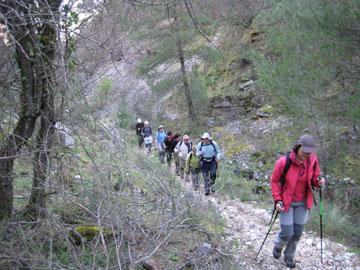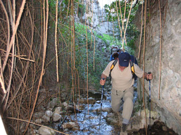 Andrés y Tomás, nuestros guías, nos dirigen sin demora hacia una profundísima garganta, el barranco de las Tinajas, ¡buen comienzo!. La vereda discurre entre dos enormes paredes de caliza que forman una hoz a través la cual discurre un arroyo.