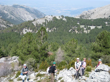 Las dejamos atrás y llegamos a la Peña del Altar donde paramos a comer. Las vistas desde este punto son realmente magníficas: el pantano del Quiebrajano al fondo de un impresionante tajo, Sierra Nevada que parece suspendida en el aire como si volara sobre la neblina, el resto de la Sierra Sur de Jaén, la Sierra de Cazorla apenas visible a través de las nubes, Jaén capital