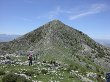 Y a partir de aquí comienza la verdadera subida en lo que al principio parece un sendero señalizado que pronto se convierte en infinidad de senderitos marcados por el ganado y por los muchos participantes de la ruta ( 170, 180 ). Al poco cada uno va cogiendo el ritmo que más le conviene y subimos, ¡subimos!, con mucha pendiente y buscando el mejor camino entre los peñascos calizos y los matorrales, admirando de vez en cuando las increíbles vistas que tenemos de espaldas y las que vamos dejando abajo.