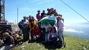 En la cumbre del pico ( 1159m.) nos encontramos con la inmensa cruz de estructura metálica y EL VIENTO. Un viento helado que viene del Cantábrico y que hace que a toda prisa rebusquemos en la mochila las prendas de abrigo. Nos reagrupamos y la típica foto al pie de la cruz con la bandera de nuestra Caja, la cual a duras penas podíamos sujetar debido al fuerte viento.