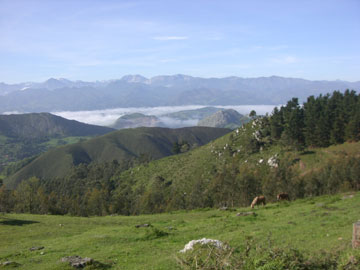 Los ánimos y las fuerzas al inicio son grandes lo que hace que la primera fuerte cuesta anunciada, para situarnos en lo alto de la Sierra del Fitu, pase casi sin darnos cuenta. Llaneamos y pasados los pinos entramos en terreno de matorral dónde nos encontramos con las primeras panorámicas de los Picos de Europa, panorámica que no nos abandonará hasta casi el final de la ruta.