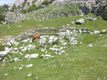 La bajada tampoco tiene sendero especialmente señalado, pero el terreno, aunque sigue siendo pedregoso, resulta más fácil de caminar. Seguimos ruta encontrándonos algunos valles ( todo verde) hasta llegar a la majada del Potril (990m.), idílico paraje en el que además de una cabaña de piedra nueva, hay unas pequeñas charcas de agua que sirven de abrevadero a las vacas que por allí se mueven y que asemejan la mano de un dinosaurio, con tres dedos, ó un trébol.