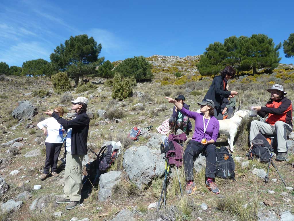 A nuestra espalda vislumbramos Sierra Arana, Sierra de Cazorla, Sierra Magina….Atravesamos el carril discurriendo sobre él unos 100m a la derecha para tomar una senda a la izquierda que asciende y entre pinares abriendo un portillo para animales, nos muestra una visión de las cumbres nevadas de nuestra sierra (collado de la cañadilla). Aprovechamos para hacer una pequeña parada y de paso deleitarnos con unos pestiños que Inma había traido y que fueron capaces de superar la panorámica que contemplábamos.