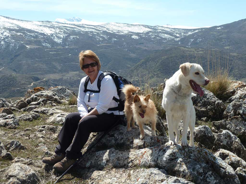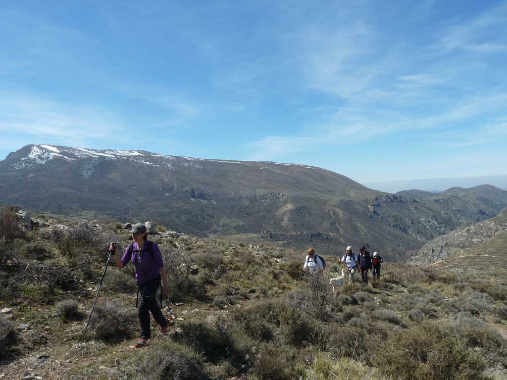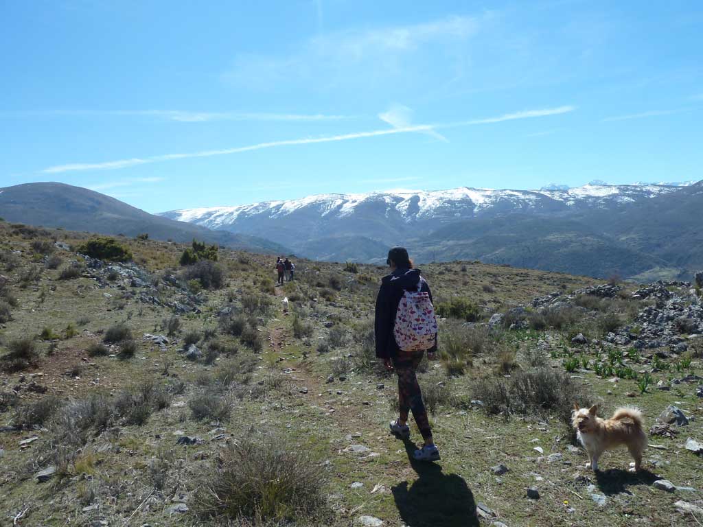 Tras reponer fuerzas, iniciamos una suave bajada por un pequeño sendero que se dejaba intuir y que nos llevó al carril del Tocón al Collado del Alguacil y Guejar Sierra. Como Antonio, no tenía mucho tiempo para realizar la ruta y temeroso de tanta fémina junta, decidió seguir dicho carril y recortar la ruta. Una vez tomada la decisión, Joaquín se ofreció a acompañarle por lo que quedamos las 5 mujeres y las 2 perras (entiendaseme bien) para continuar con nuestra meta.