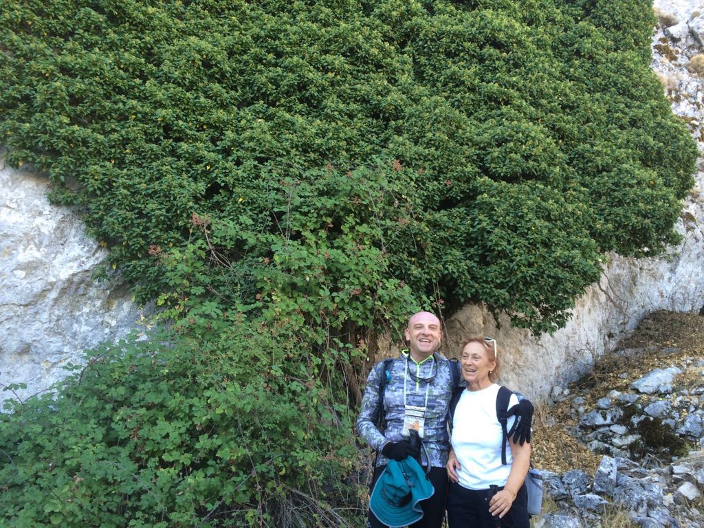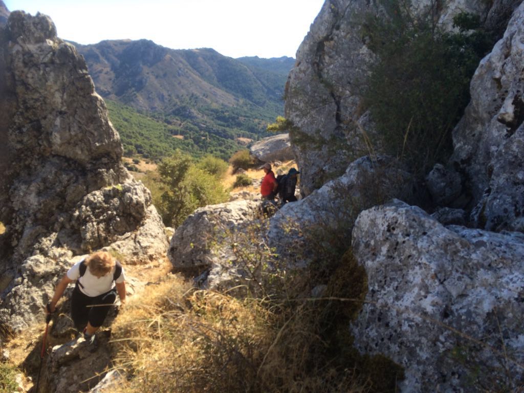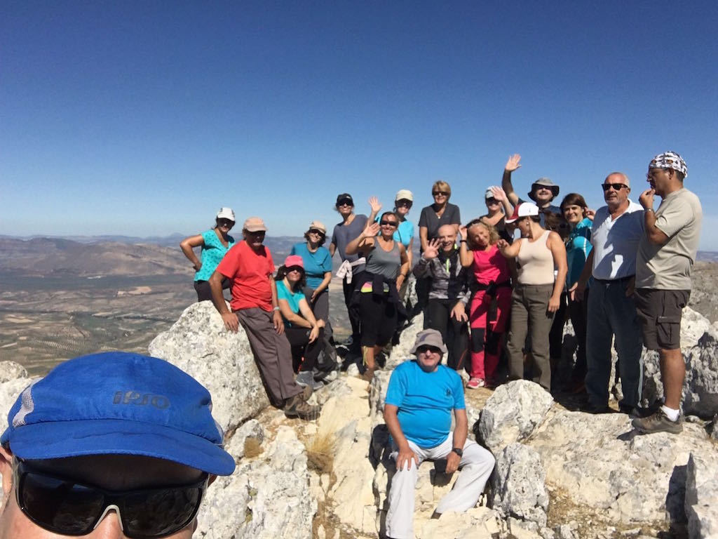 Un buen número de insolidarios siguieron en dirección al Jorobado. Lidia decidió que el guía había perdido la poca credibilidad que le quedaba y se fue sola a hacer cumbre, dejándose llevar por su intuición. Un kilómetro después la vimos –gracias a los prismáticos de Luis- subiendo por la ladera, campo a través con Miguel –al que había arrastrado a la perdición- hacia el camino correcto. En medio el guía y tres más y en la cola Loli explicándole la zona a algunas de las nuevas incorporaciones. Después de dos horas Nacho, al que nos encontramos cuando bajábamos del Peñón de la Mata, y siete intrépidos más (Gema, Luis, Miguel, Lidia, Joaquín, Araceli y el guía, que llegó por separado por lo de la orden de alejamiento) hicieron cumbre.