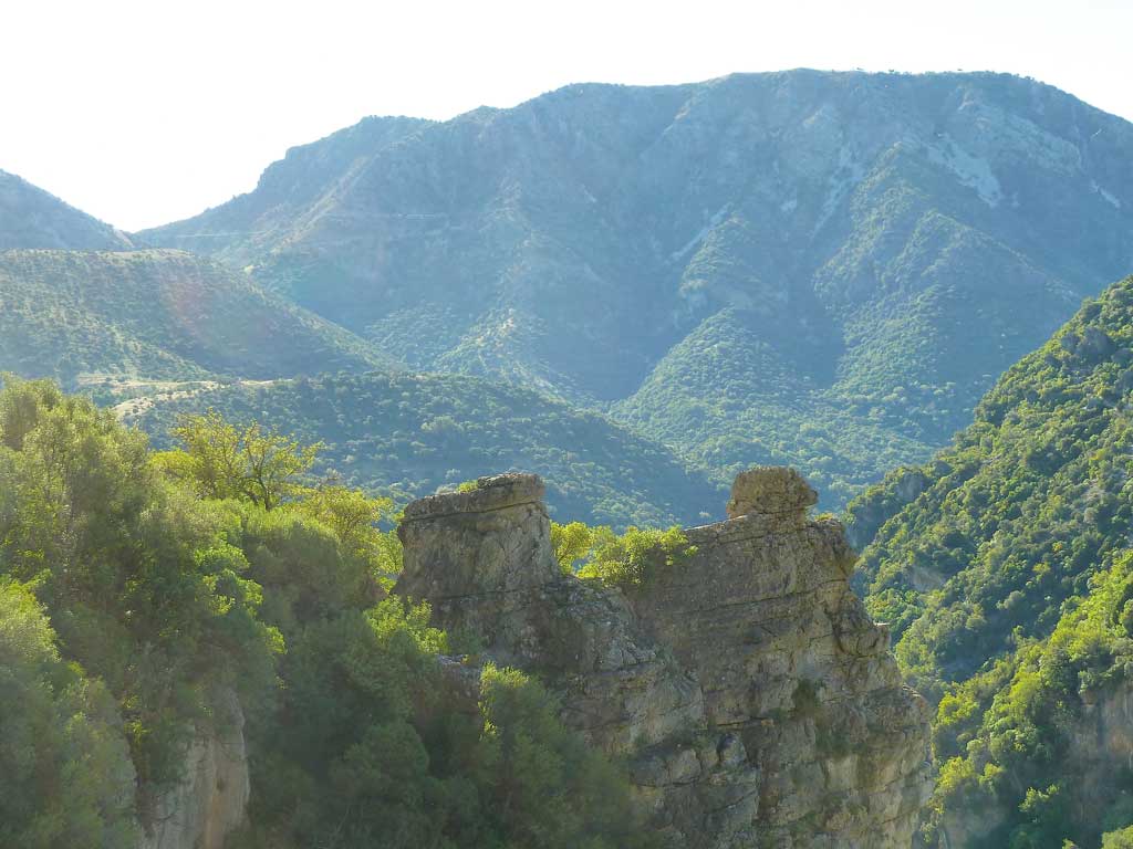 Un desvío a la izquierda nos lleva a un mirador que nos muestra las primeras vistas de la garganta. Aunque no es mucho lo que desde aquí se puede ver. Seguimos camino que ahora se dirige hacia unos altos farallones, rodeado de palmitos, acebuches, lentiscos, retamas, jaras. En el cielo planean los buitres leonados. Contemplamos su majestuoso vuelo, haciendo círculos, desplazándose con las corrientes de aire. Por esta zona existe una de las colonias más importantes de buitres leonados.