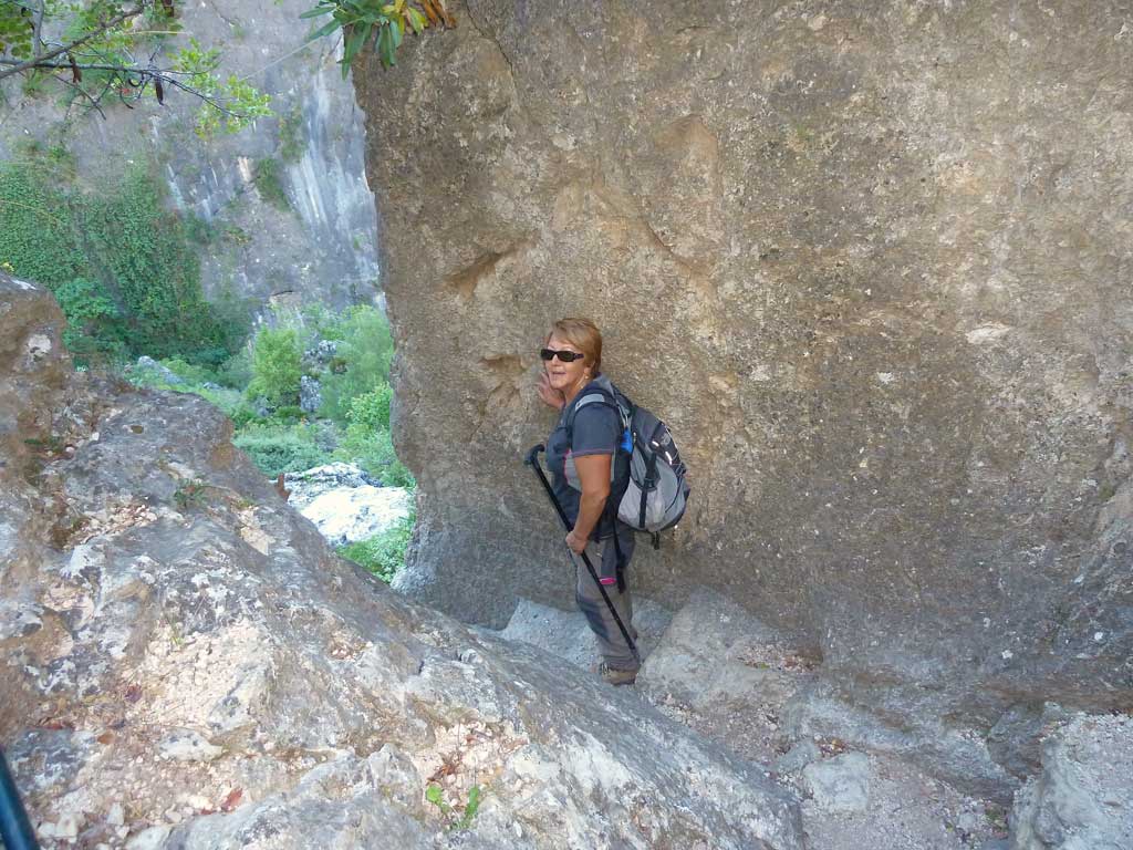 Más próximos al fondo de la garganta hay que atravesar una enorme piedra que tiene abierta una estrecha ranura y escalones tallados en la misma piedra.