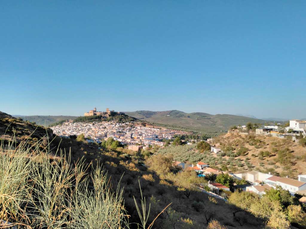 Varios son los senderos que suben y salen desde el mismo casco urbano o desde la Fuente del Rey. Este que por indicación de Curro escogemos nos lleva hasta la Cruz del Rayo. Cruz blanca flanqueada por varios bancos de forja de hierro que configuran un hermoso mirador desde donde se contempla una visión inédita de la localidad: al frente la Fortaleza y a los pies la blanca población abrazada a la colina  y los campanarios de varias iglesias y conventos.