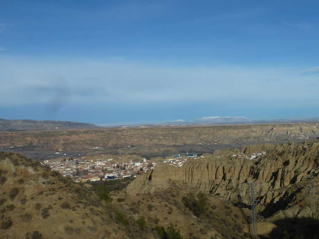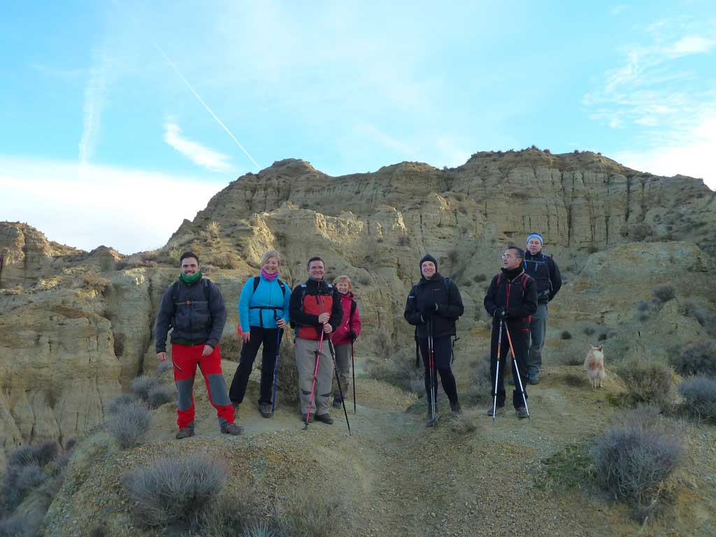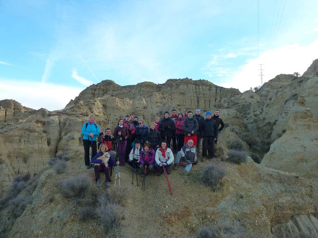 Desde entonces los sedimentos de aquel mar han ido evolucionando y han configurado el espectacular paisaje llamado “malas tierras” tuvimos a Rafa que nos dio bien la matraca con el temita, ja, ja (quiero agradecer al compañero, que hizo mucho más amena la ruta con sus explicaciones). Comenté que en otoño, los arboles dorados le daban un toque muy bonito, pero alguien dijo que con la Sierra nevada la estampa era preciosa. Un poco más adelante junto a una caseta de vigía tomamos alguna fruta o algo más calórico como la palmera de chocolate que nos ofreció Joaquín.