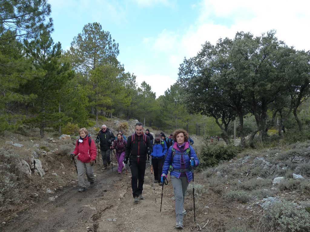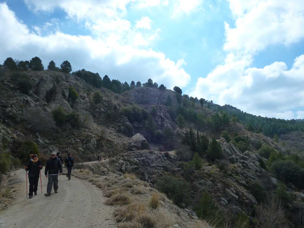 … No hubo suerte y nos pasamos la entrada que debíamos tomar para llegar al punto de encuentro. Hubo que hacer una maniobra no muy apropiada y, olvidándonos de la indicación de dirección obligatoria, entrar por el siguiente acceso. Aparcamos para luego volver a arrancar con la pretensión de llegar en coche hasta el inicio de la ruta. Tuvimos que desistir de ello tras comprobar que éramos muchos los que nos habíamos reunido y que no habría sitio para dejar tanto coche. Por concluir, volvimos a aparcar los coches en el pueblo y comenzamos a andar pasando por debajo de la antigua carretera nacional para subir por carretera hasta el sendero que, por la Loma de la Rampa –nombre apropiado- sube a la Casilla del Agua y al Peñón de Granada.