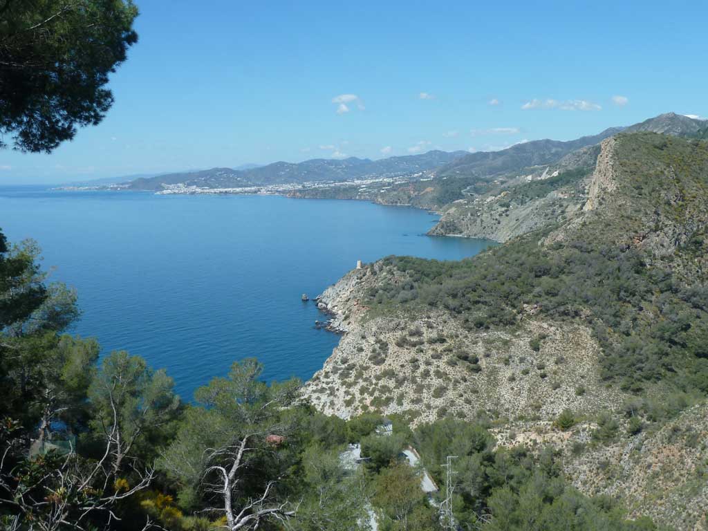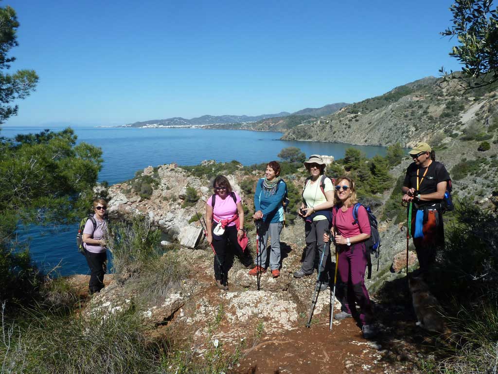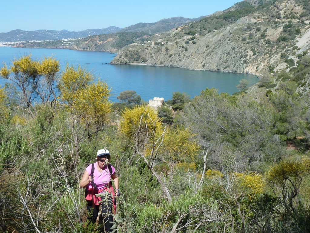 Empezamos a saltar rocas una tras otra con cuidado de nos caernos pues el día anterior había estado lloviendo y aún permanecían bastante mojadas y resbaladizas. Tras este pequeño aperitivo de adrenalina emprendemos la subida de “aupa” entre rocas y frondosa vegetación. Una vez arriba podemos apreciar las hermosas vistas de todo el litoral malagueño con la población de Nerja al fondo.
