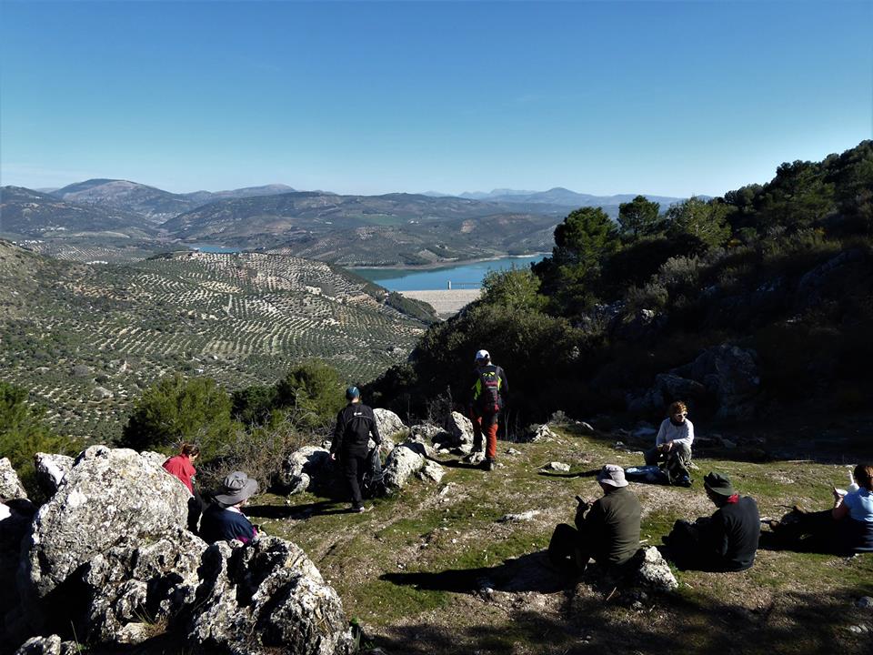 En el camino Antonio se encuentra una pequeña culebra muerta, la coge y después se la pasa a Araceli, que es tan amante de la naturaleza, otros pasamos de largo sin mirar mucho. Seguimos entre olivos, por el camino algunos deciden no subir, otros seguimos hasta arriba, tenemos vistas por un lado al pueblo de Colomera, entre valles y montañas y por otro lado al pantano. Otra foto en la cima y bajamos para tomar el bocadillo con los que han quedado abajo, descanso y seguimos en dirección a Colomera.
