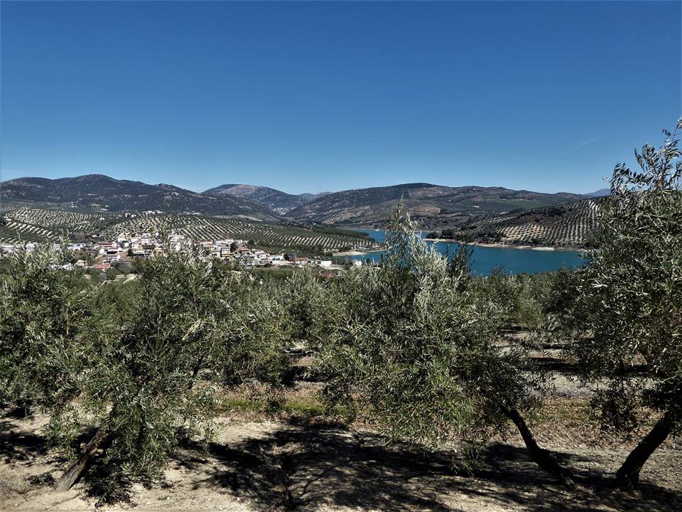 Nos vamos acercando al pantano, las vistas son espectaculares, con el agua azul intenso del pantano, los valles y montañas de olivos alineados. Los almendros están en flor, algunos con las almendras pequeñitas, “jayosas”, Jesús creo que las prueba.