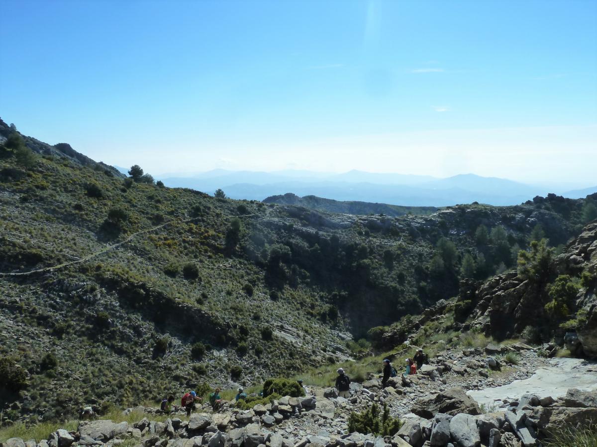 Continuando a nuestro asumible ritmo,  seguimos incansables nuestro ascenso por un sendero  que a cada momento,  te regala unas fantásticas vistas sobre la Axarquía, más maravillosas cuanto mayor es el ascenso y a lo largo del cual, se puede disfrutar de una vegetación condicionada por su exposición a los agresivos rayos solares, dada su orientación sur y que va,  desde pinares y algunos bosques de encinas, hasta ejemplares de cambrón, bayón, cenizo, y mostajo, diferenciada de la que se da en la vertiente granadina, de orientación norte.