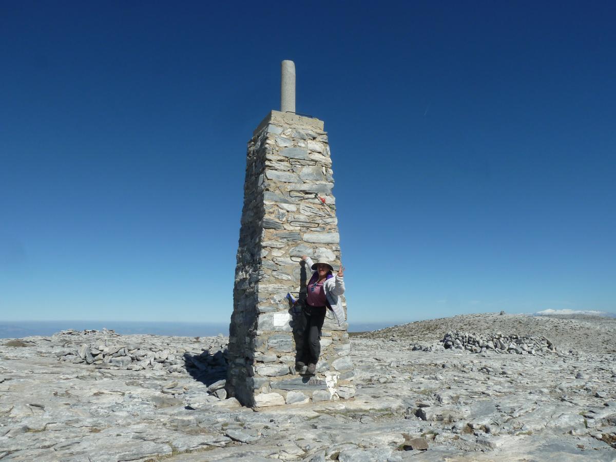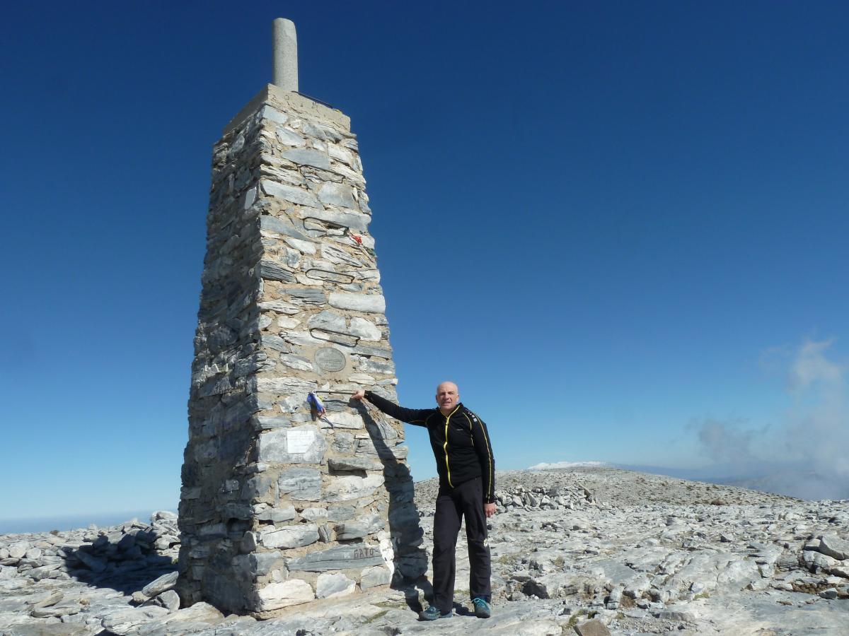 Y Verdaderamente, el esfuerzo realizado en nuestro empeño,  queda recompensado con la sensación de inmensidad y libertad que percibes cuando conquistas  la cima de esta mole. Aunque el día estaba sembrado de nubes que se extendían  bajo nuestros pies, lo que nos impidió contemplar las vistas en toda su inmensidad, y que en un día claro se puede abarcar la  visión de la Costa de Málaga, Mar de Alborán y a veces incluso la costa africana, Sierra de Los Filabres, etc ;  aun así eran unas vistas excepcionales las que alcanzábamos a divisar,  destacando las nevadas cumbres de Sierra Nevada,  además de la grata y alegre sensación de conquista de objetivos , a lo que hay que sumar el abrazo de felicitación con que te recibía  El Cordi, que también sumó puntos.
