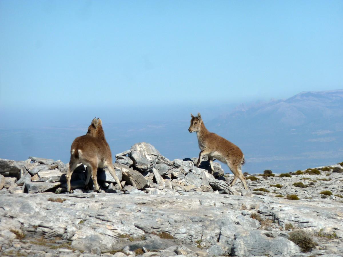 Una de las agradables sorpresas al llegar a la cumbre, fue una pequeña familia de cabras montesas que nos deleitaron con su presencia y con la oportunidad de poderlas fotografiar a placer, pertenecientes a la extensa  cabaña de estos animales en la zona, que se han recuperado espectacularmente en los últimos tiempos y que según se estima, puede haber en torno a unos 2000 ejemplares, solo en la vertiente malagueña.