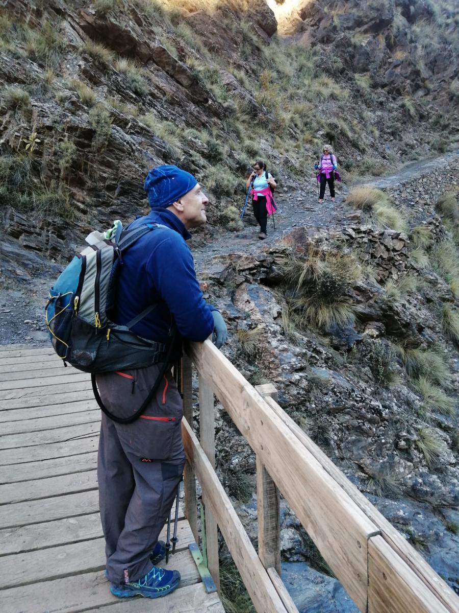 Pues ahora empieza lo bueno¡¡¡¡¡¡¡, tras cruzar el puente comienza el tramo más duro del recorrido, además de la falta de señalización, menos mal que Miguel es un magnífico guía, la senda se vuelve bastante estrecha  y algo peligrosa, este tramo es conocido como Barranco de Lucía, por la que  nos encontramos con algunos grupos y senderistas que hacen el camino a la inversa que nosotros. Tras alcanzar el refugio del Aceral, uff, ya ha pasado lo peor…jjjjj,  continuamos camino hasta el refugio de la Cucaracha, dónde tras hacernos las obligadas  fotos  en el “pedrusco” al filo del barranco  y disfrutar de las  maravillosas vistas,  Miguel nos invita a tomar una fruta para reponer fuerzas y continuar camino.