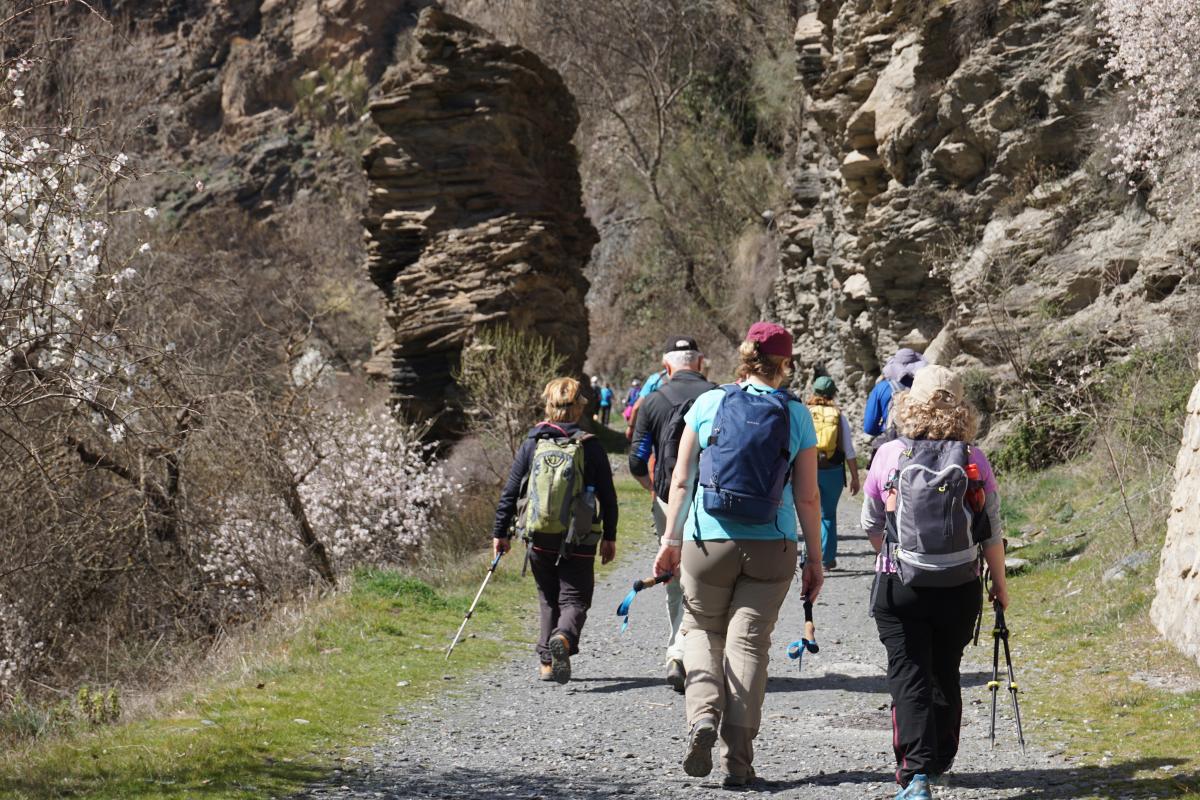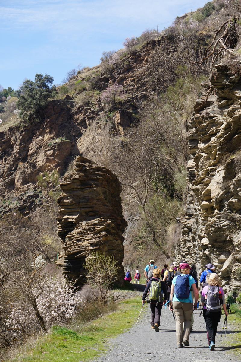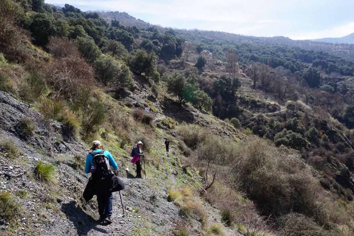 Güéjar-Sierra y sus diferentes alturas quedan inmediatamente debajo. Al otro lado del Genil y de la cola del Pantano de Canales, vemos el Castillejo y el Castañar, y de frente se distinguen algunas alturas menores como la loma Papeles, y por encima, tocando el azul del cielo, majestuosos, el pico Alcazaba y el Mulhacén con poca nieve en sus respectivas caras norte. Primero el Mulhacén y después el Alcazaba paulatinamente se irán perdiendo de vista según vamos avanzando. Todo el camino sobre la acequia, a ratos cubierta y a ratos al aire libre, transitamos entre frutales, almendros en flor, robles, higueras, encinas, cerezos…, que proporcionan agradable sombra. También se ven bastantes huertos cultivados, marjalillos de habas y otras verduras.