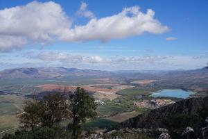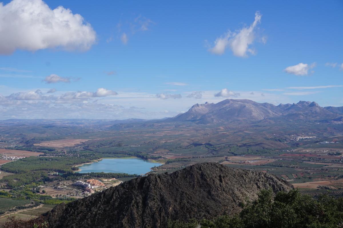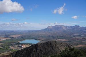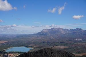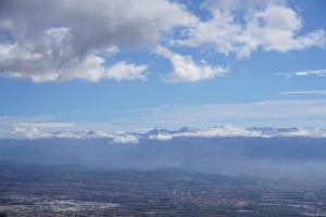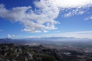 Nos dirigimos al Morrón de Enmedio que, como su nombre indica, es el que está en el centro de los tres, el más alto del macizo, y en esa dura ascensión los últimos metros son aún más empinados, pero para facilitar el ascenso hay unas cadenas a las que agarrarse. Ya hemos llegado a la cumbre, donde sentados en torno a un mojón (en el buen sentido) o vértice geodésico, descansamos largamente. Este lugar es sin duda la mejor atalaya para contemplar la Vega granatensis en todo su esplendor y en toda su anchura y largura. Aquí podemos constatar que el promontorio de Sierra Elvira es una isla sobre la llanura veguera. En vista de 360 grados, vemos todos los pueblos que conforman el área metropolitana penibética y todo el gran circo montañoso que encierra a la Vega. Aquí viene al pelo aquello que decía García Lorca de que Granada sólo tiene salida por las estrellas.
