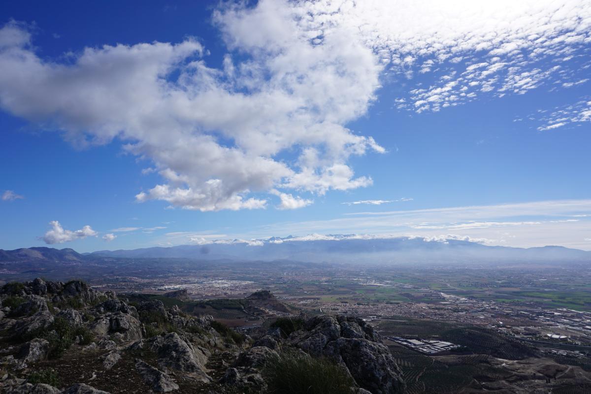 De inmediato empieza la primera de nuestras ascensiones, pasando por los restos de la muralla de la antigua Medina Elvira y más adelante por lo que parece un rastraculos puesto para diversión de la grey menuda, pero es en realidad una gran roca lisa a flor de terreno y en tobogán que invita a dejarse caer. Un poco más arriba damos con una grieta de las varias que hay en esta sierra de la que sale aire caliente, el vapor de las aguas termales que guarda en sus entrañas este karts que es Sierra Elvira. Por la izquierda abordamos la subida al monte Sombrerete, una tachuela en comparación con lo que tendremos que subir después, pero que tiene su dificultad. Desde la cima apreciamos la primera de las extraordinarias vistas sobre la Vega que nos ofrece la ruta.