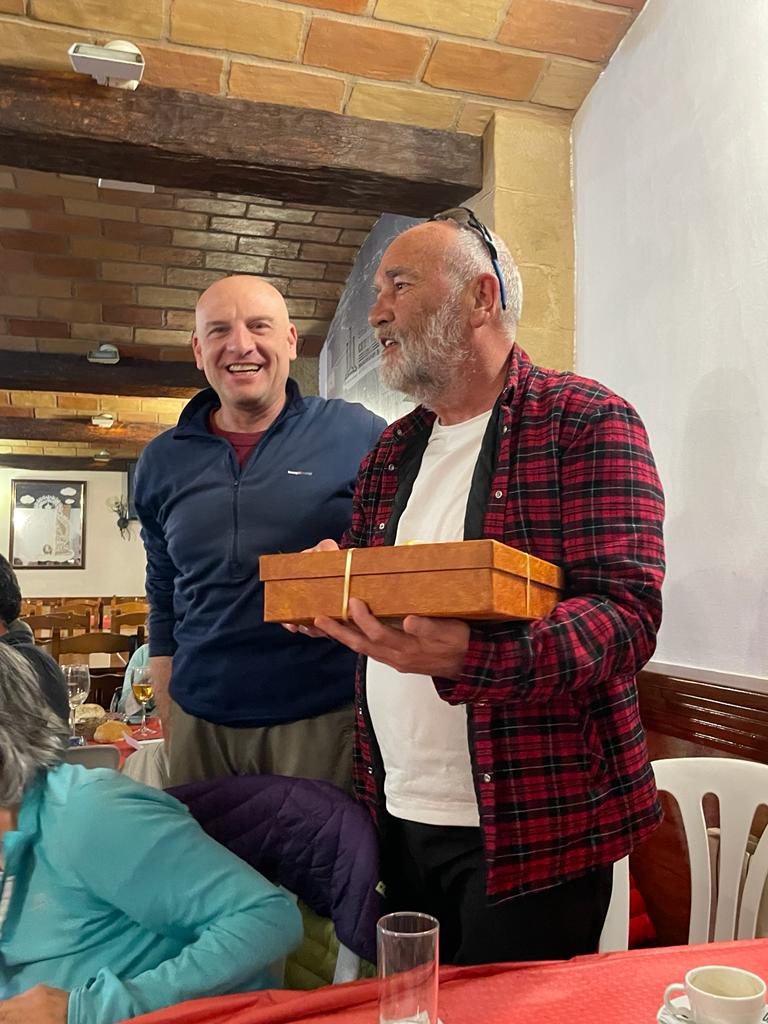 Varios de los regalos fueron libros sobre la Sierra o el senderismo, el mío es una fuente de cerámica con una inscripción en agradecimiento. Me gusta. Mil gracias. Lo que hago es para mí un placer y no me cuesta nada, y con esto aprendo muchísimas cosas, y vuestra muestra de cariño me anima a seguir. Muchas más gracias.